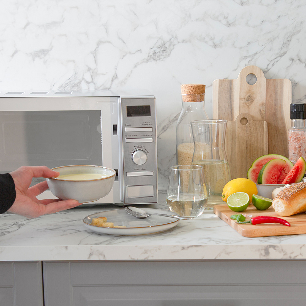Med 6 effektlägen och 6 förinställda autoprogram är det enkelt att värma mat, tina råvaror eller tillaga enklare rätter. Den automatiskt roterande tallriken ser till att maten värms jämnt, samtidigt som timerfunktionen på hela 95 minuter ger flexibilitet för längre tillagning.