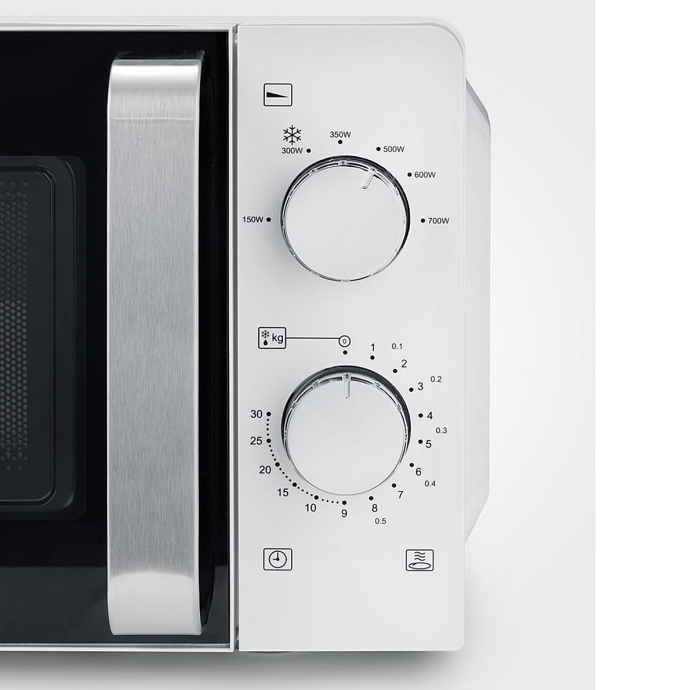 Den manuella kontrollpanelen gör det lätt att justera både effekt och tid, medan den roterande tallriken ser till att maten blir jämnt uppvärmd. En praktisk mikro för mindre kök, studentrum eller som extra mikro i sommarstugan.