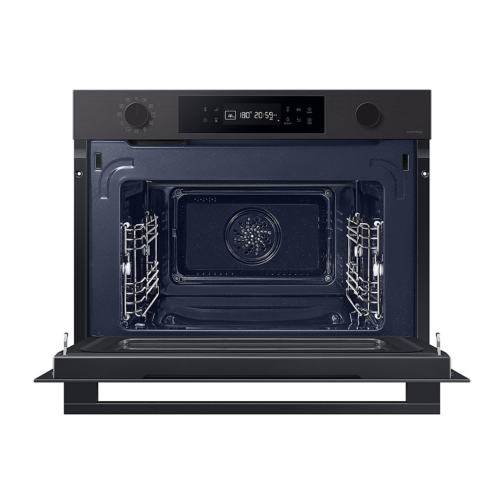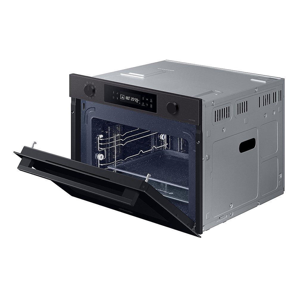 Samsung Series 4 NQ5B4553FBB/U1 är en modern och effektiv kompaktugn med 50 liters kapacitet, mikrougnskombination och smarta funktioner som gör matlagningen både snabbare och enklare. Med kombinationen av varmluft och mikrovågsteknik tillagas maten betydligt snabbare än i en traditionell ugn, samtidigt som den inbyggda mikroomröraren ger jämn värmefördelning och perfekt resultat både på insidan och utsidan. Du kan använda funktionerna separat eller kombinera dem för extra flexibilitet. SmartThings Cooking ger personliga receptförslag, veckomenyer och guidad matlagning, medan Wi-Fi-anslutning låter dig styra ugnen direkt från mobilen – från att starta förvärmning till att justera temperatur och timer. Ångrengöring gör dessutom rengöringen snabb och enkel genom att lösa upp smuts och stänk så att de enkelt kan torkas bort utan skrubbning.