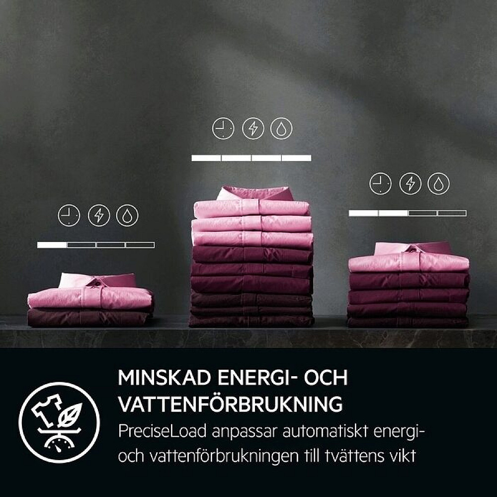 Effektiv användning av energi och vatten. PreciseLoad analyserar tvättmängden och justerar programtid samt energi och vattenförbrukning därefter. Det innebär att du alltid får ett optimerat program som sparar resurser utan att kompromissa med resultatet oavsett om du tvättar lite eller mycket.