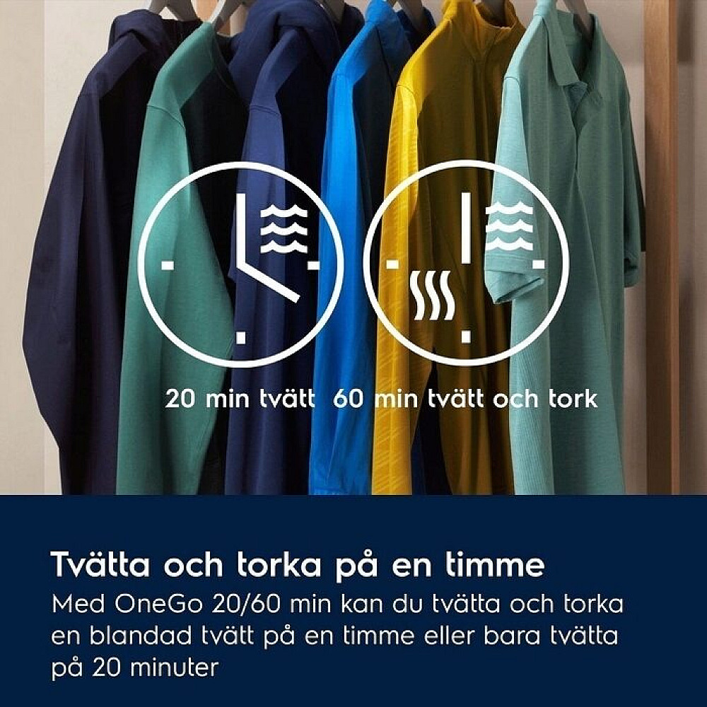 Snabba program för en flexibel vardag: OneGo programmet gör det möjligt att tvätta och torka mindre mängder tvätt på bara en timme. Perfekt när du behöver rena kläder snabbt utan att kompromissa med resultatet.