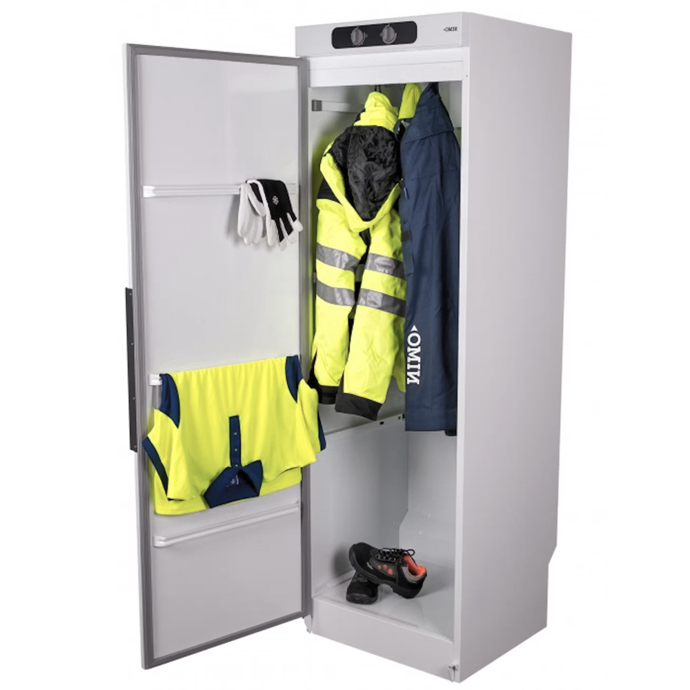 Det robusta torkskåpet är utrustat med ett 2 kW värmeelement, frånluftssystem och ventilationsanslutningar för effektiv drift. Den vänsterhängda dörren och justerbara fötterna gör installationen flexibel, medan den vita finishen gör att skåpet smälter in i både privata och gemensamma tvättutrymmen.