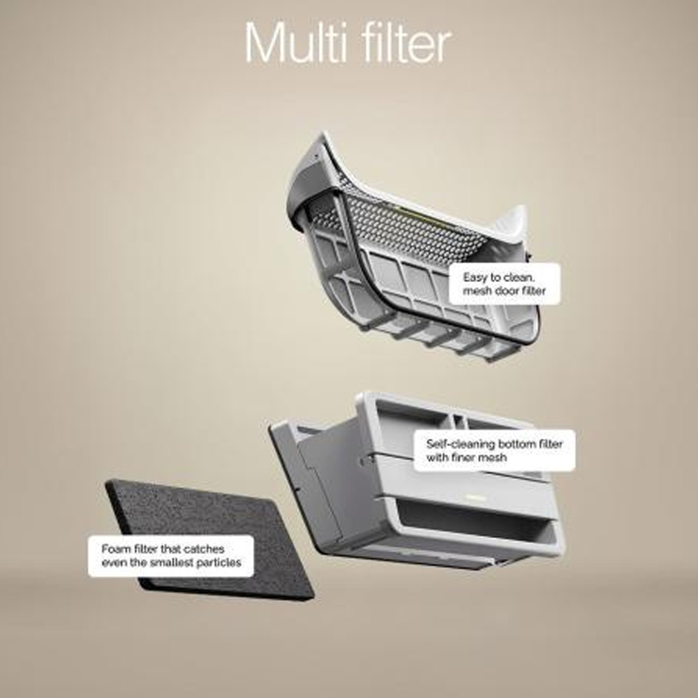 Multifiltersystemet med tre filter skyddar värmepumpen från ludd och bidrar till jämn prestanda över tid. Systemet är även en fördel för allergiker och astmatiker tack vare effektiv filtrering.