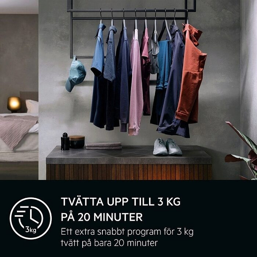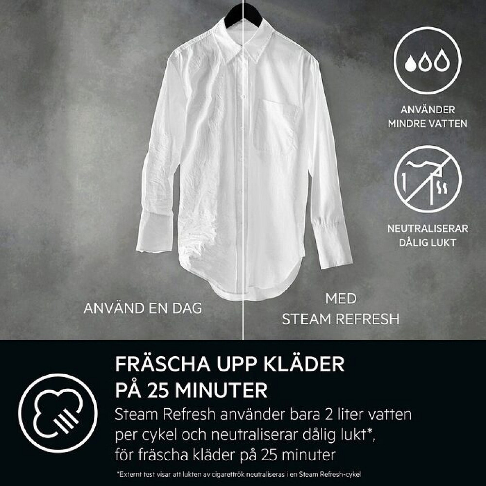 Fräscha upp kläder med ånga. Ångprogrammet gör det möjligt att snabbt fräscha upp plagg och reducera både lukt och skrynklor. Perfekt för kläder som inte behöver en full tvätt.
