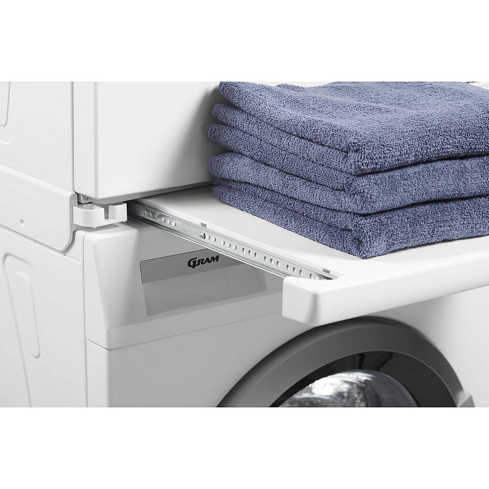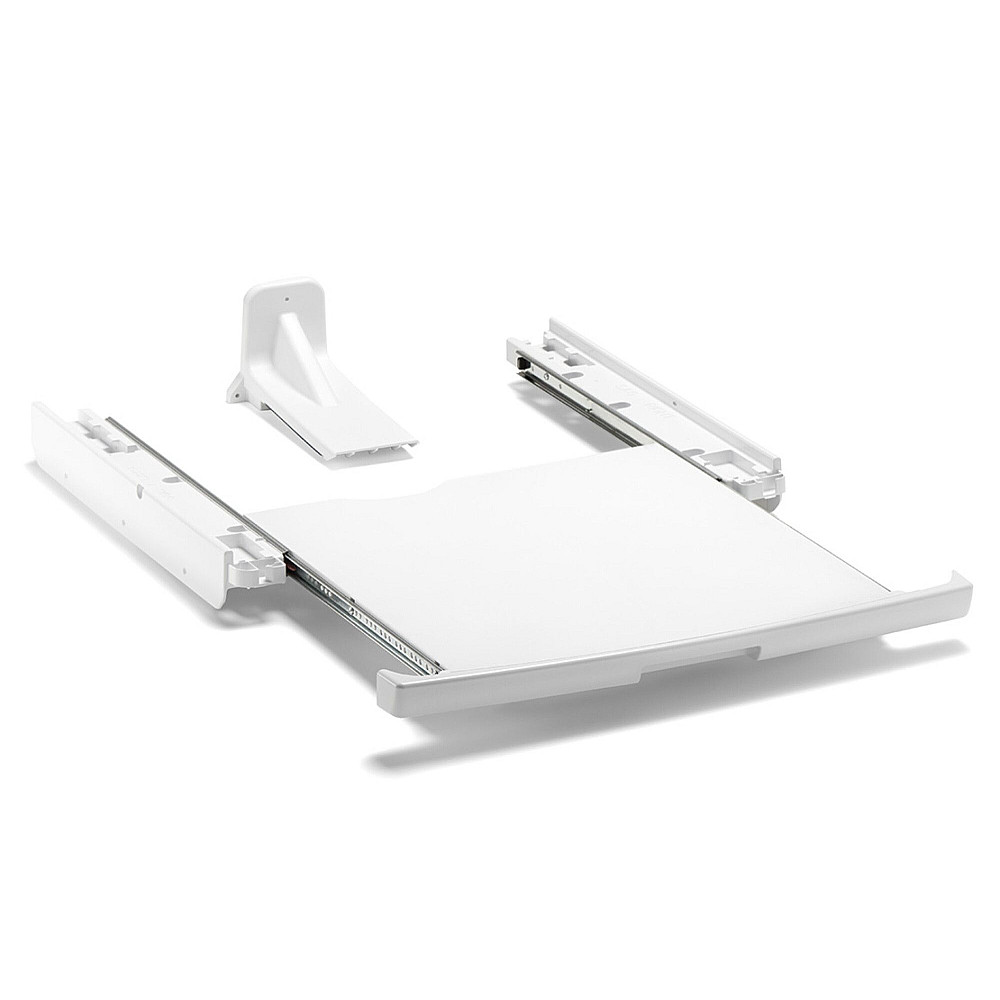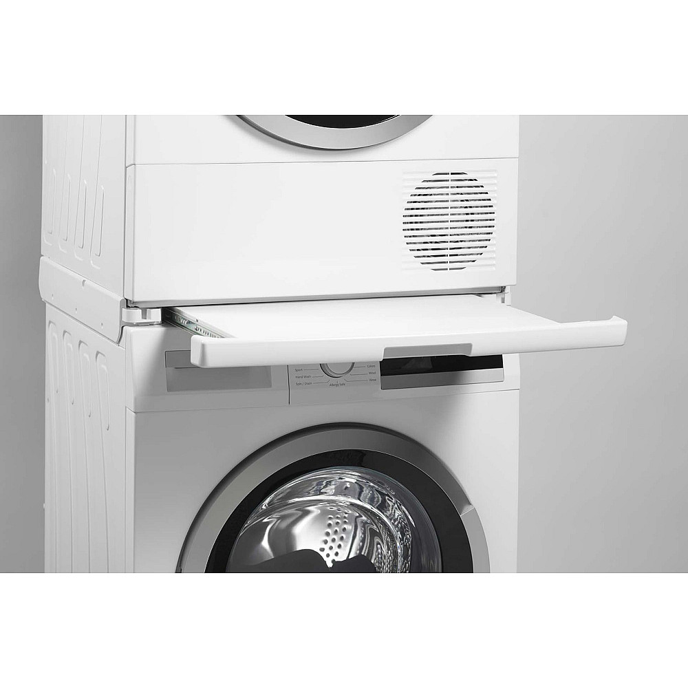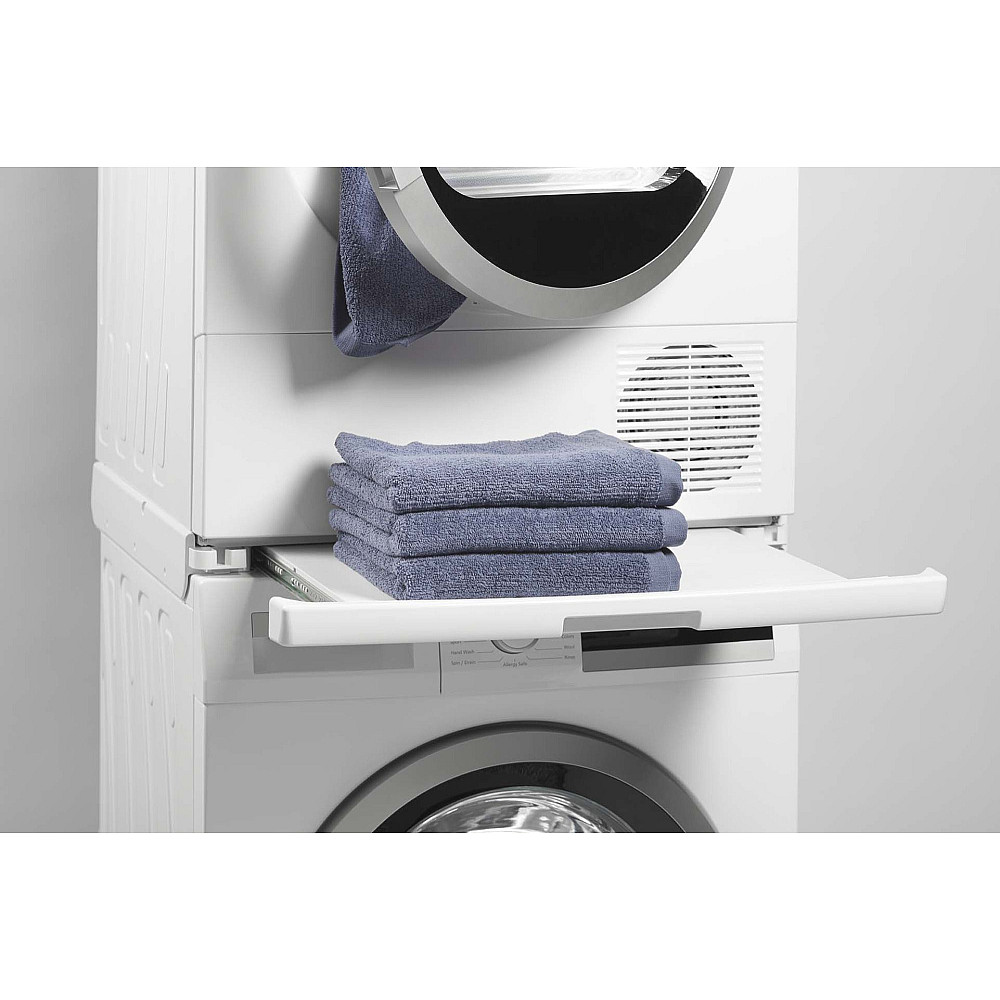 Fästet passar från och med 6-serien och är konstruerat för att ge stabilitet och trygg stapling även vid hög belastning. Hyllan gör det enkelt att hålla ordning på tvättmedel, tillbehör eller småprylar som behövs nära till hands.