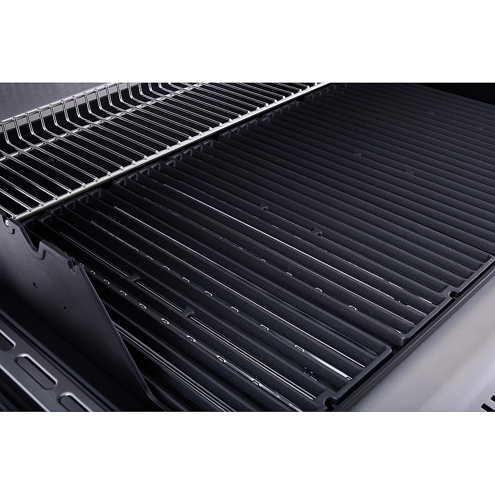 Den generösa grillytan gör det enkelt att tillaga flera rätter samtidigt. De tjocka gjutjärnsgallren håller värmen väl och ger en jämn tillagning. Värmehyllan gör att färdig mat kan hållas varm tills allt är redo att serveras.