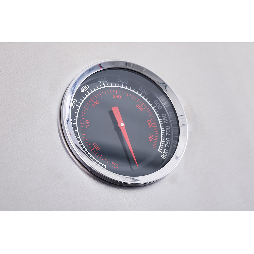 Grillen är utrustad med fyra brännare i rostfritt stål som ger en hög och jämn värme. En extra sizzle burner i sidobordet skapar snabbt en intensiv hetta som är idealisk för att bryna kött och ge smakrik stekyta innan maten flyttas till huvudgrillen.