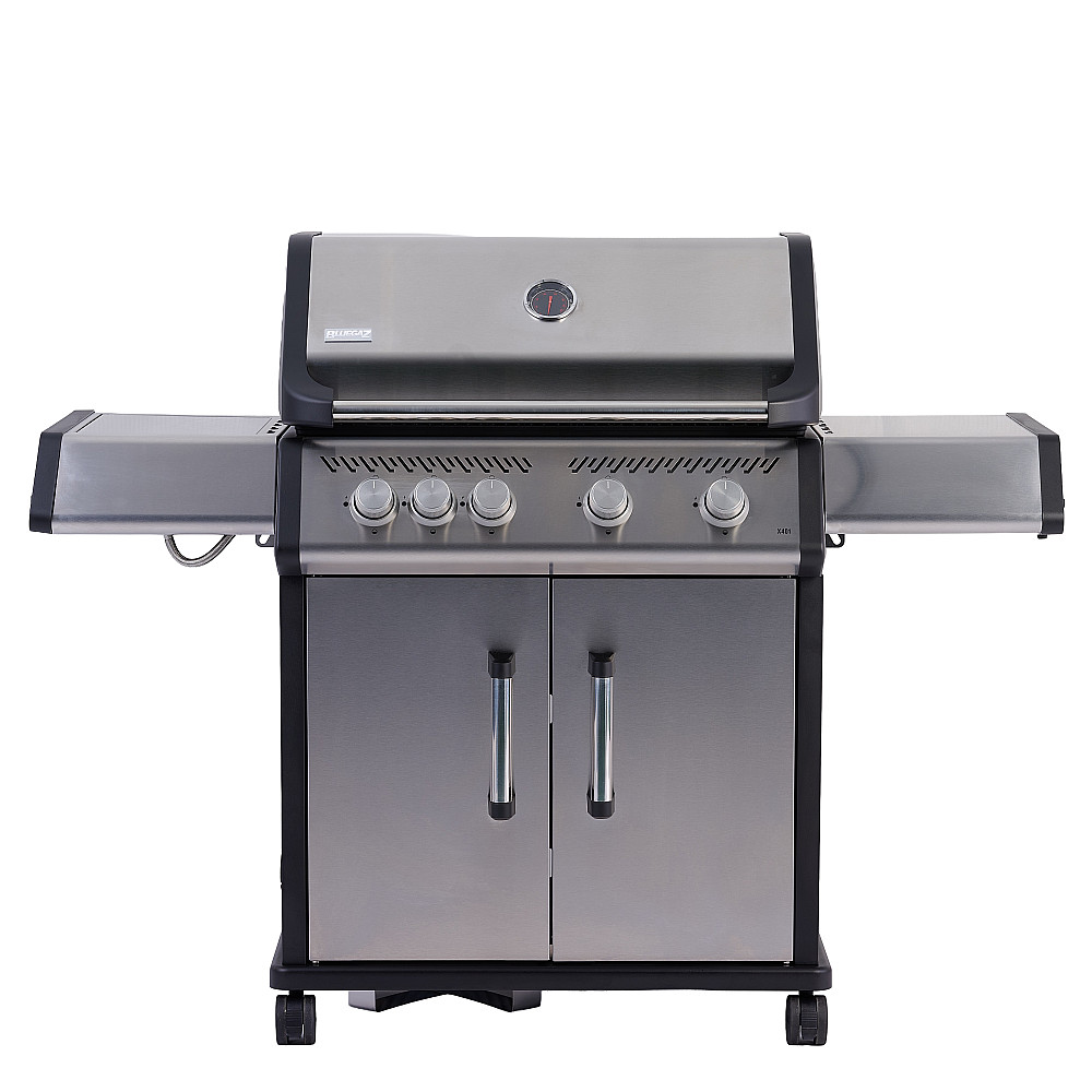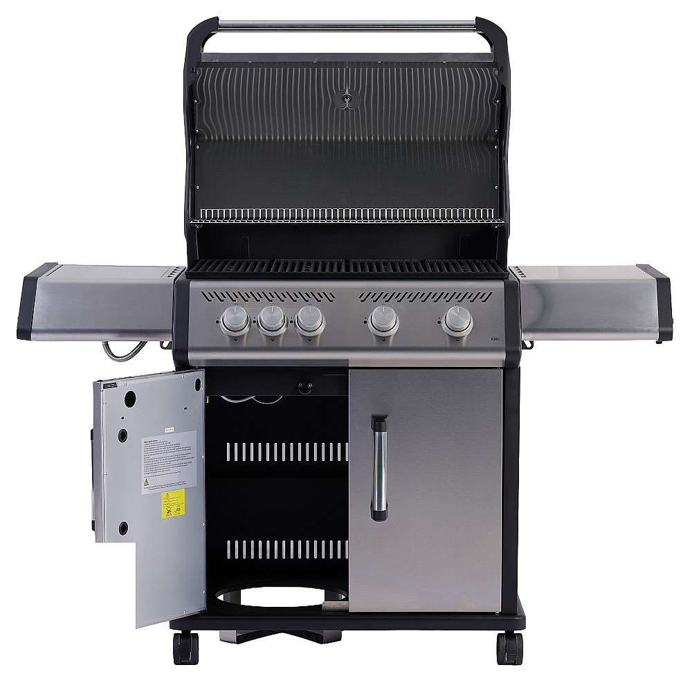 Grillen har två stora sidobord, ett rymligt skåp för gasolflaska och tillbehör samt en praktisk korg på insidan av dörren. Med sex redskapskrokar är det enkelt att hålla ordning på grillverktygen. Konstruktionen i rostfritt stål och formgjuten aluminium ger lång livslängd och ett proffsigt uttryck.