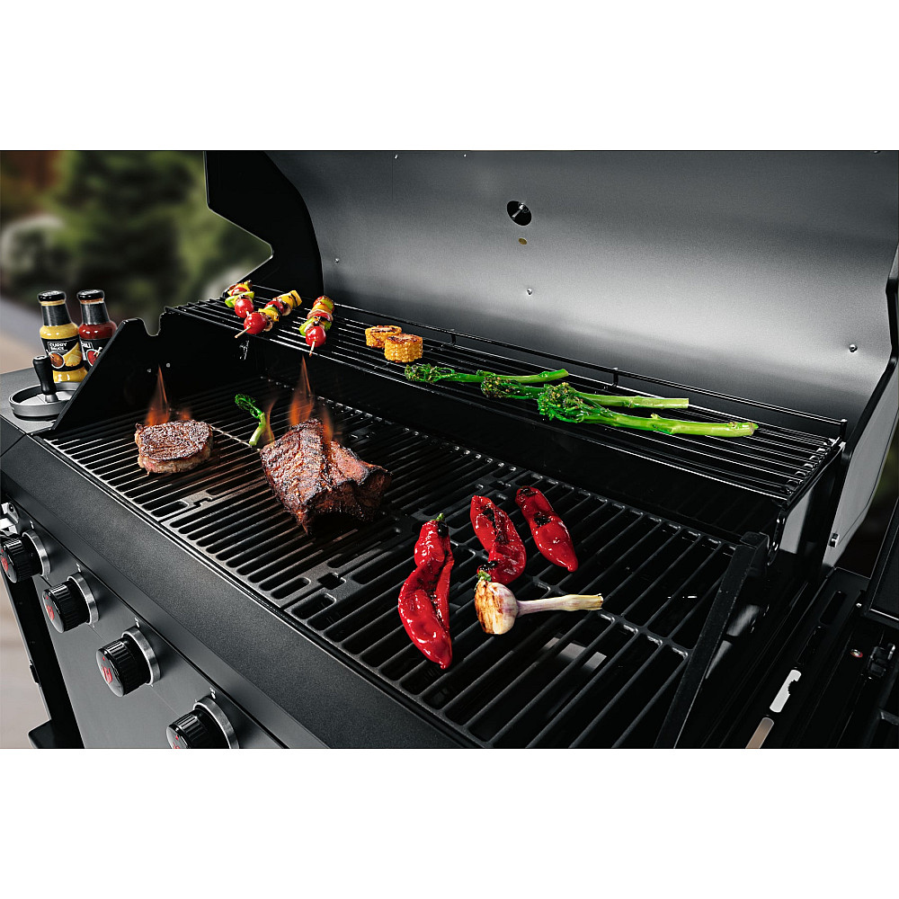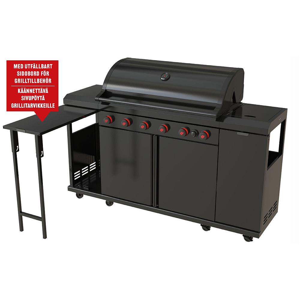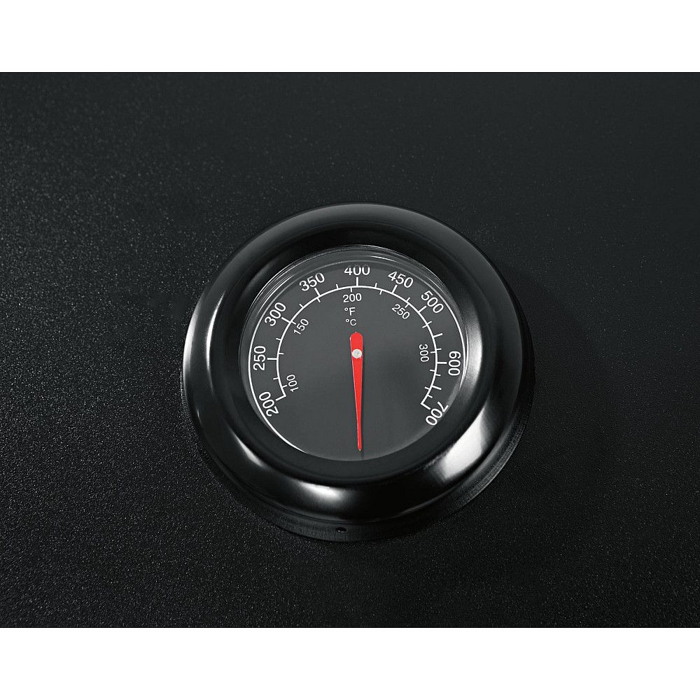 Elegant design med smarta detaljer. Den svarta pulverlackerade stålkonstruktionen ger ett exklusivt och stilrent uttryck. Den dubbelisolerade grillhuven med inbyggd termometer bevarar värmen effektivt, medan det uppfällbara sidobordet skapar extra arbetsyta. Grillen är dessutom utrustad med kapsylöppnare, hållare för hushållspapper och generöst med krokar för grillredskap.