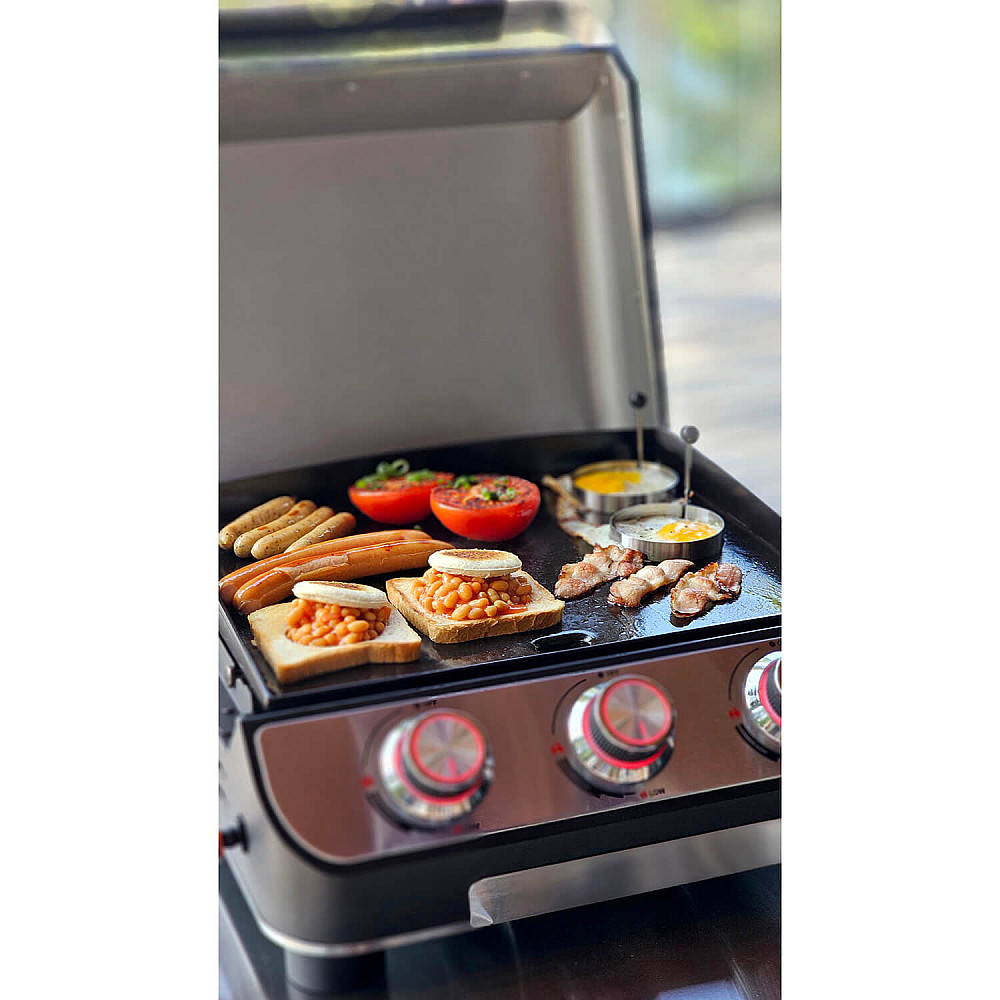 Emaljerad plancha för jämn tillagning Grillytan består av en emaljerad plancha som sprider värmen jämnt och håller temperaturen stabil även vid längre matlagningstillfällen. Den släta ytan gör det enkelt att steka, vända och servera maten med perfekt resultat.