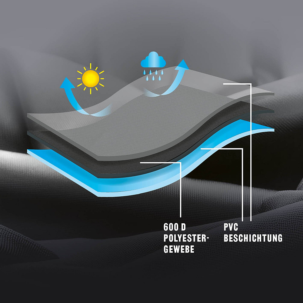 Extra tåligt material. Överdraget är tillverkat av kraftig 600D polyesterväv med PVC-innerbeläggning, vilket ger ett mycket bra skydd även vid kraftigt regn. Den höga UV-beständigheten motverkar blekning och håller överdraget snyggt över tid.