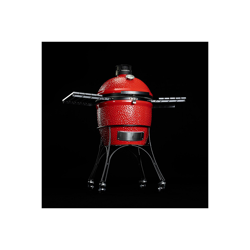 Genomtänkt och hållbar konstruktion där det keramiska chassit säkerställer jämn värme och låg bränsleförbrukning. Grillgaller och kolkorg är tillverkade av rostfritt stål och står emot både värme och slitage under lång tid. De robusta sidoborden ger extra arbetsyta och kan fällas ned vid förvaring.