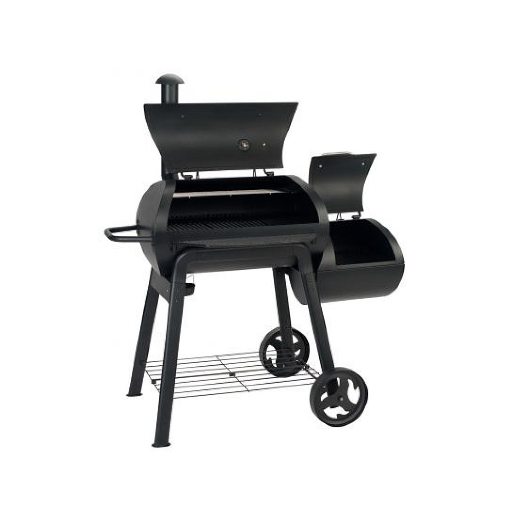 Äkta amerikansk BBQ med sidokammare. I den separata sidokammaren eldas kol, briketter eller trä för att skapa rök och jämn indirekt värme. Röken leds vidare in i huvudkammaren genom en smart öppning, där maten tillagas långsamt och får sin karakteristiska BBQ-smak. Ventilerna gör det enkelt att justera temperaturen med precision.