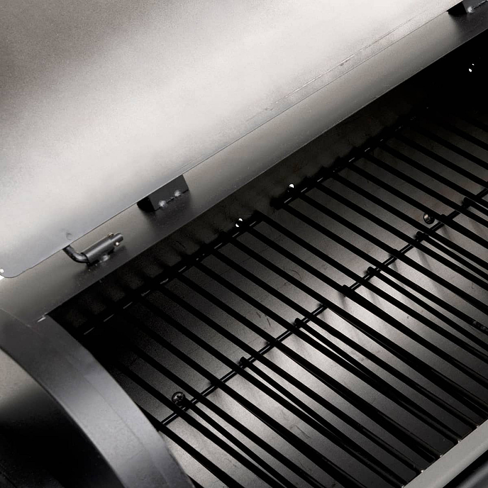 Stabil konstruktion med smarta detaljer. De emaljerade stålgallren är både hållbara och enkla att rengöra, medan den integrerade termometern i locket gör det lätt att hålla rätt temperatur genom hela tillagningen. Den praktiska fronthyllan ger extra arbetsyta för redskap, kryddor och tillbehör.