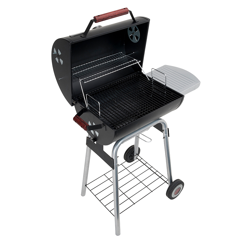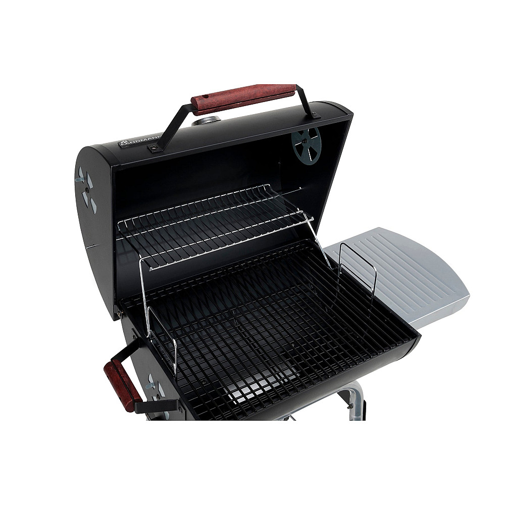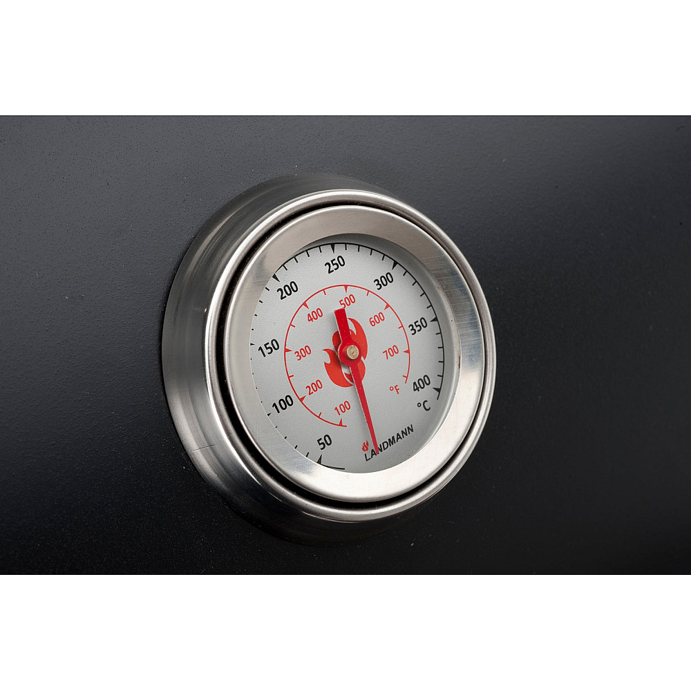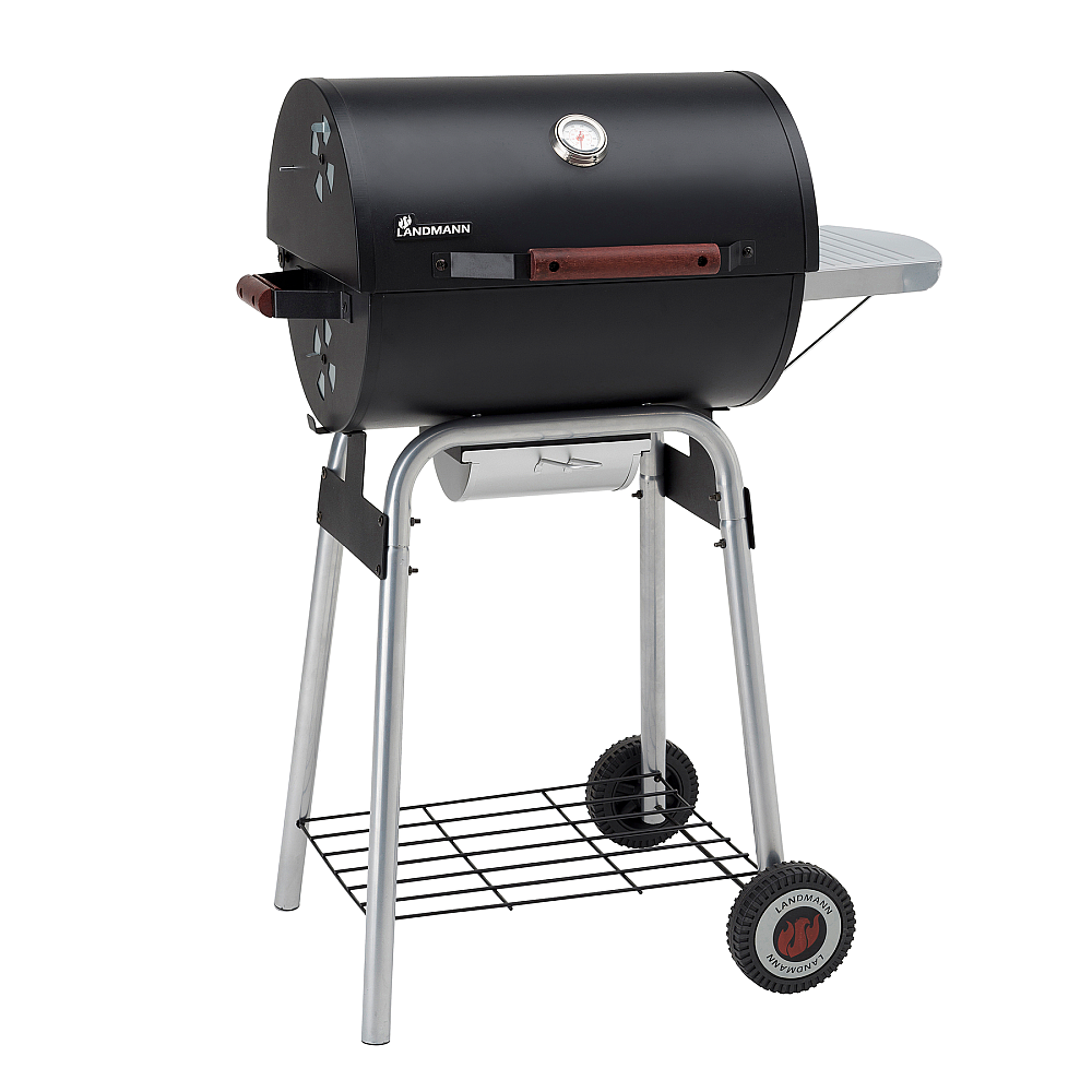 Specifikationer i korthet. Landmann Black Taurus 440 har höj- och sänkbart kolgaller, grillyta 44 × 36 cm, varmhållningsgaller, avtagbart sidobord, integrerad termometer i locket, smidig askuppsamlare, handtag och två hjul. Mått: höjd 104,5 cm, bredd 81 cm. Vikt 19 kg en perfekt balans mellan stabilitet och rörlighet.