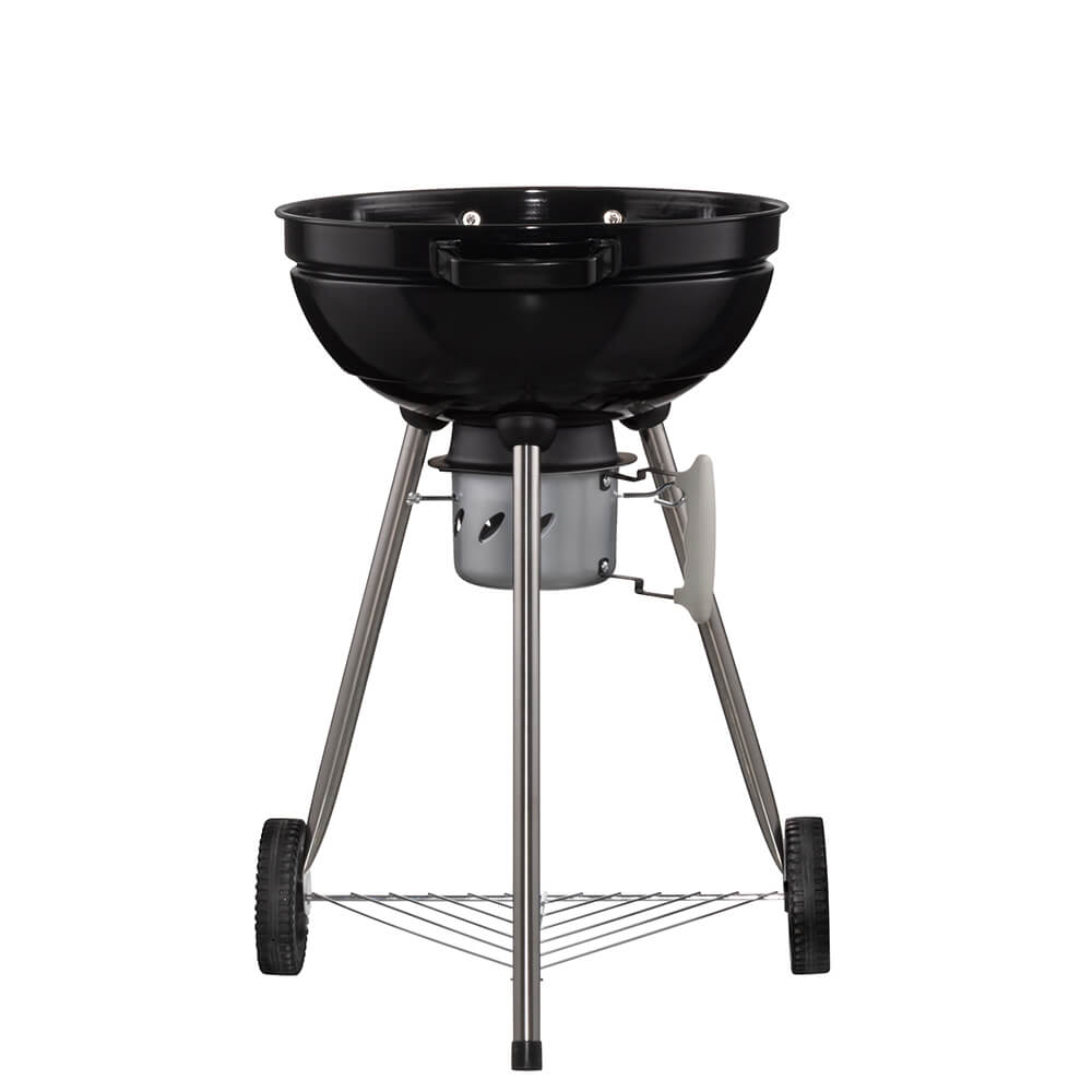 Designad för praktisk användning De robusta handtagen och de två stora hjulen gör grillen enkel att flytta runt på uteplatsen. Den emaljerade ytbehandlingen ger grillen ett snyggt utseende samtidigt som den skyddar mot värme och väderpåverkan.