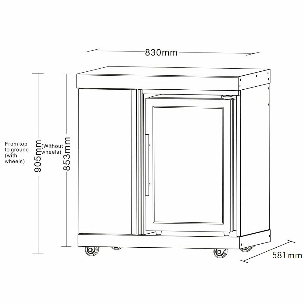 Produktspecifikationer. Fristående modul i rostfritt stål 304SS med kylskåp och förvaringsskåp. Kapacitet kyl 63 liter. Temperaturspann 316°C. Ett kylskåp med fyra hyllor och ett förvaringsskåp med tre hyllor i rostfritt stål. Glasdörr, innerbelysning och kompressorkylning. Spänning 230V. Mått 83 x 85,5 x 58 cm (bredd x höjd x djup). Vikt 60 kg. Ljudnivå 39 dB. Energiförbrukning 128 kWh/år. Energiklass F.