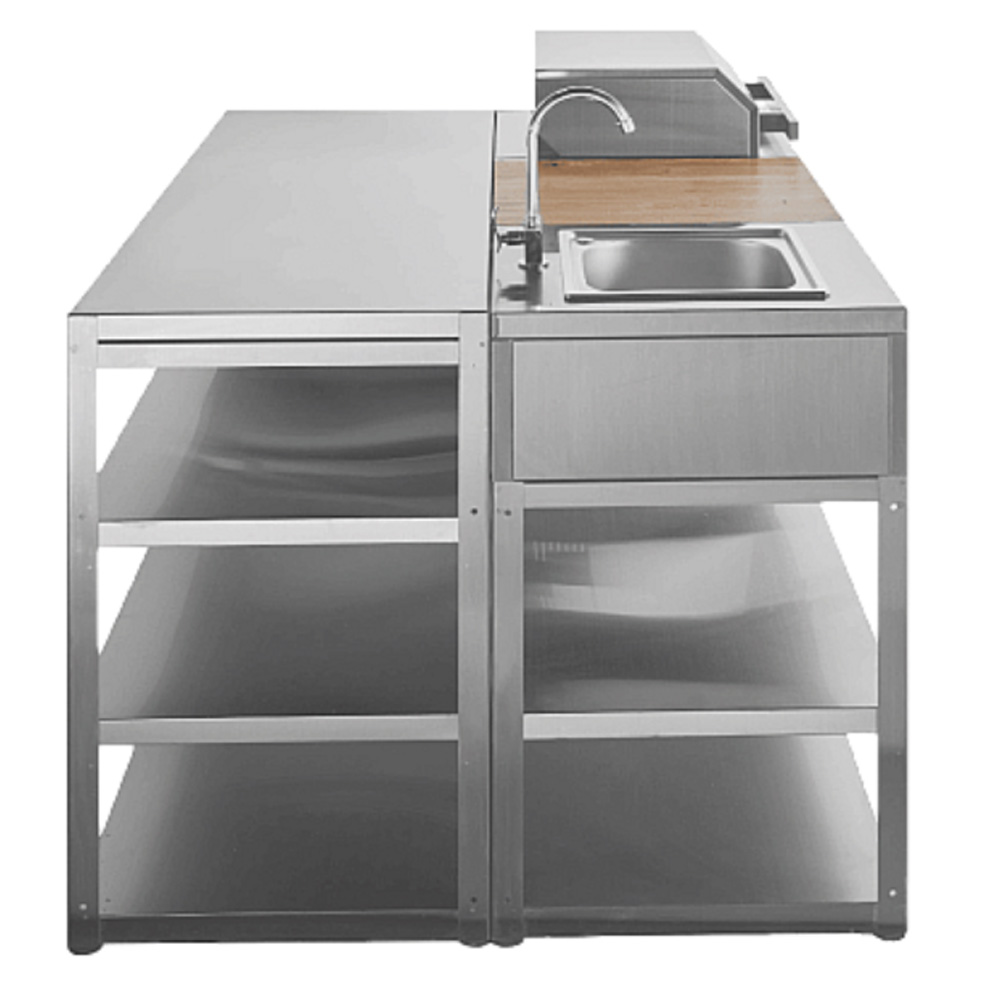 Praktisk förvaring och stilren design. Den öppna konstruktionen i rostfritt stål 430 SS ger ett modernt och enhetligt uttryck. Under arbetsytan finns tre rymliga hyllplan som erbjuder gott om plats för redskap, fat och andra kökstillbehör.