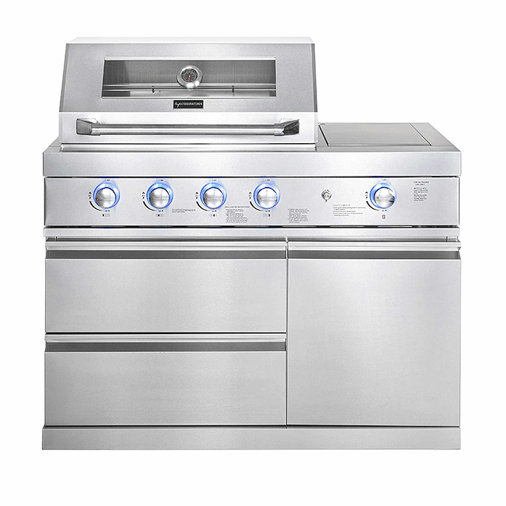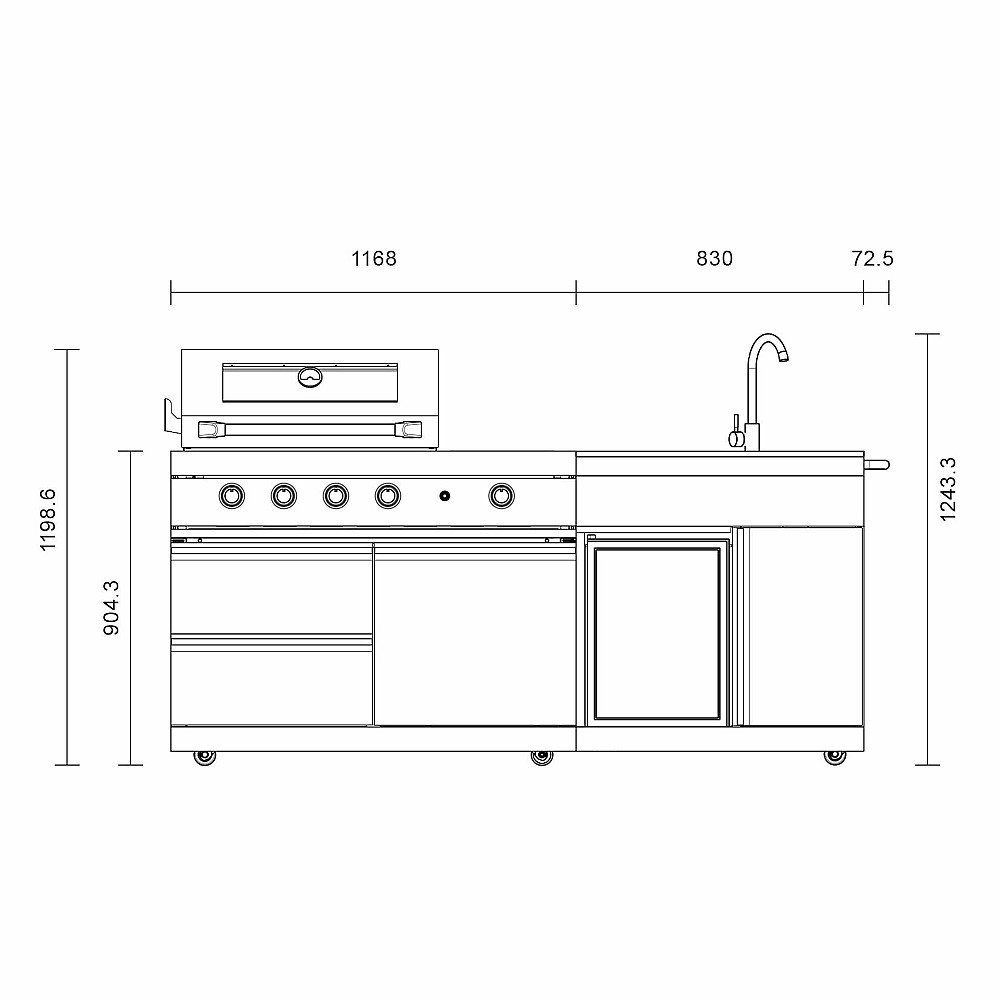 Specifikationer: Fristående utekökspaket som inkluderar en gasolgrill med fyra brännare och infraröd sidobrännare samt en fristående modul med kylskåp, vask och förvaringsskåp med utdragbar soptunna. Tillverkat i rostfritt stål 430 SS med arbetsbänk i svart sintrad sten med marmorering. Total bredd 207,1 cm, djup 58,1 cm exklusive handtag och höjd från mark till bänkskiva 90,4 cm inklusive hjul. Modulerna kan placeras i valfri ordning.