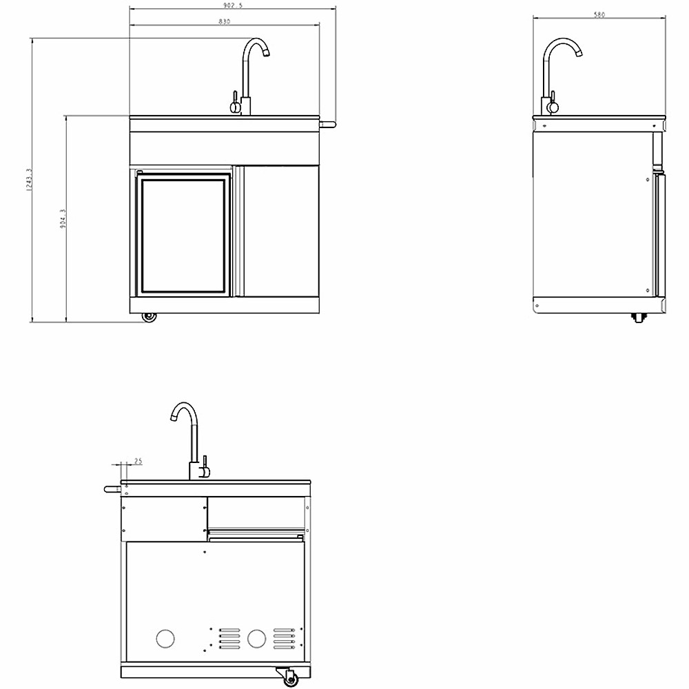 Specifikationer: Fristående utekökspaket som inkluderar gasolgrill med fyra brännare och infraröd sidobrännare, fristående modul med kylskåp, vask och förvaringsskåp med utdragbar soptunna samt fristående modul med förvaringsskåp. Konstruktion i svart pulverlackerat aluminiumpläterat stål och arbetsbänk i svart sintrad sten med marmorering. Total bredd 301,8 cm, djup 58,6 cm exklusive handtag och höjd från mark till bänkskiva 90,4 cm inklusive hjul. Modulerna kan placeras i valfri ordning.