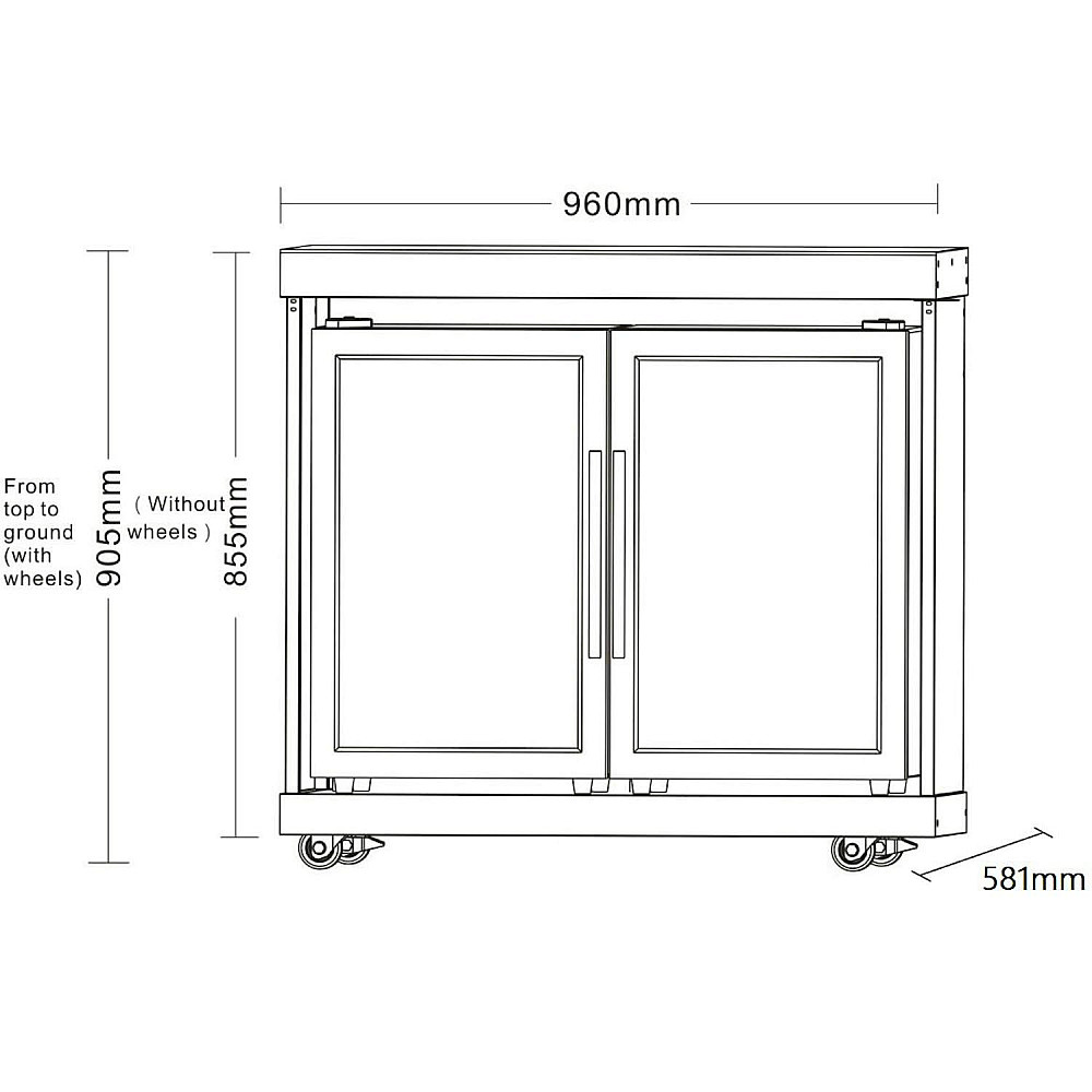 Specifikationer. Paketet inkluderar två fristående moduler och en fristående pizzaugn. Det består av en fristående modul med kylskåp med dubbeldörrar samt en fristående modul med pizzaugn. Total bredd är 174,6 cm, djupet på modulerna är 58 cm utan handtag och höjden från mark till bänkskiva är 90,5 cm inklusive hjul. Modulerna kan placeras i valfri ordning och bilden är endast en inspirationskälla.
